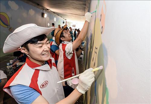 | △ 기아차 임직원들이 서울 서초구 잠원동 경부고속도로 횡단지하보도에 야광벽화를 그리고 있다. |