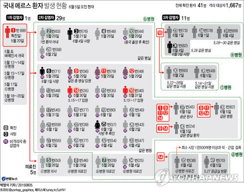 5일 보건복지부에 따르면 이날 추가로 확진된 메르스 환자 5명 중 41번(70·여)은 지난달 27일 삼성서울병원 응급실에서 14번 환자에게 감염된 것으로 추정된다. 이 병원에서 발생한 환자는 4일 복지부가 확진 사실을 발표한 35번(38) 의사 환자 이후 두 번째다.
