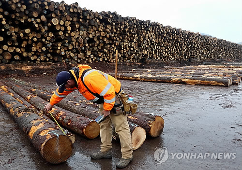 | △ (AP=연합뉴스) 미국 오리건 주의 한 목재 생산업체에서 노동자가 통나무의 크기를 재고 있다. |