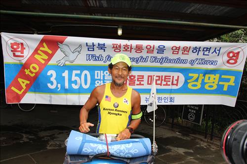 (유엔본부=연합뉴스) 박성제 특파원 = 미국에 거주하는 한국 교포 강명구(58) 씨가 125일간의 '남북평화통일 기원' 미국 횡단 마라톤을 무사히 마쳤다.