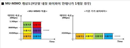 하지만 MU-MIMO 상용화 시 1.3Gbps를 3명에게 433Mbps씩 나눠서 보내거나 2명에게 866Mbps와 433Mbps로 나눠서 보내는 방식으로 서비스가 가능해져 효율적인 기가 와이파이 망 사용이 가능해진다.