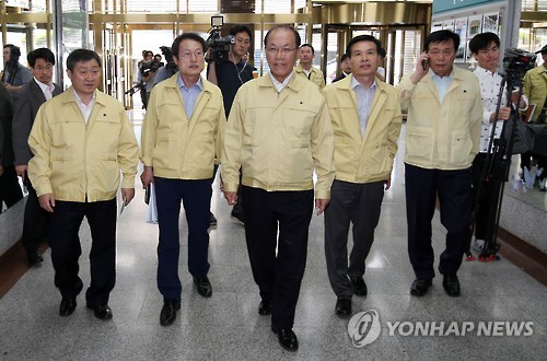 | △ 교육청 메르스 대책본부 찾은 황우여 (서울=연합뉴스) 한종찬 기자 = 황우여 사회부총리 겸 교육부 장관(가운데)이 7일 오후 서울 종로구 서울시교육청을 방문, 조희연 서울시 교육감(왼쪽 두번째)과 함께 메르스 대책본부로 향하고 있다. 2015.6.7 saba@yna.co.kr |
