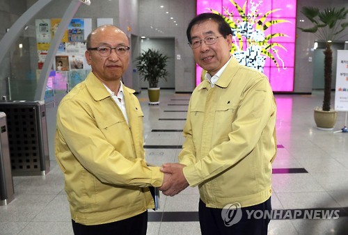 | △ 손 잡은 문형표 보건복지장관과 박원순 서울시장 (세종=연합뉴스) 배재만 기자 = 문형표 보건복지부 장관과 박원순 서울시장이 7일 오후 정부세종청사 보건복지부 공용브리핑룸에서 중앙 정부와 지자체 간 메르스 총력 대응을 위한 협력 합의사항을 발표한 후 나오며 악수하고 있다. |