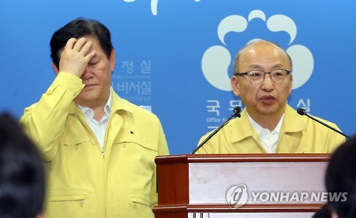 | △ 답하는 문형표 장관, 머리 만지는 최경환 총리대행 (세종=연합뉴스) 배재만 기자 = 문형표 보건복지부 장관이 7일 오전 정부세종청사 국무총리실 브리핑룸에서 열린 정부의 중동호흡기증후군(메르스) 대응 조치 발표 기자회견에서 취재진의 질문에 답하고 있다. 왼쪽은 최경환 국무총리 직무대행. |