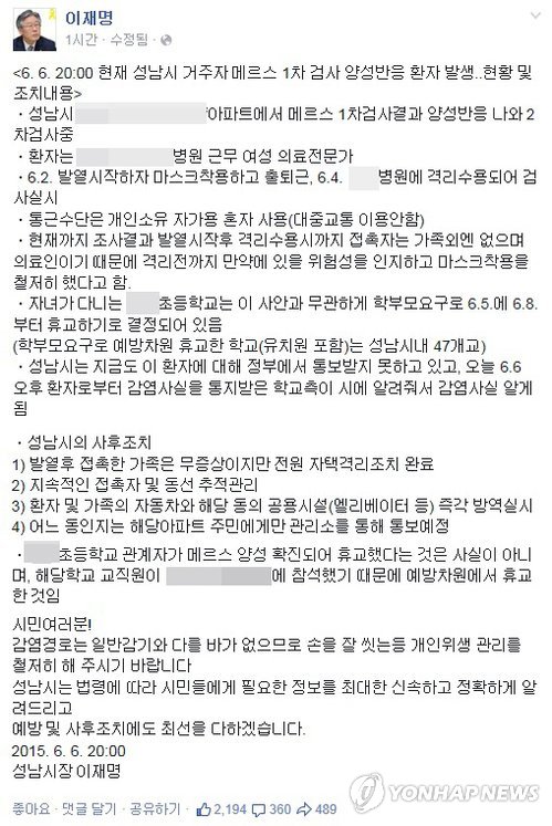 | △ 이재명 성남시장이 신상정보를 공개한 1차 양성 판정자의 가족 3명이 모두 메르스 음성 판정을 받은 사실을 자신의 페이스북을 통해 알렸다. 사진은 이들에 대한 신상정보를 공개했던 이 시장의 지난 6일 페이스북. (연합뉴스 자료사진) |