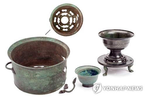 | △ 울산 영축사지 고려 청동 유물 (울산=연합뉴스) 이상현 기자 = 8일 울산 영축사지 발굴 현장에서 출토된 고려시대 청동시루. 2015.6.8 <<울산박물관 제공>> leeyoo@yna.co.kr |