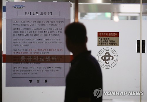 | △ 건국대 병원에서도 메르스 환자 발생 (서울=연합뉴스) 김도훈 기자 = 7일 오후 서울 광진구 건국대병원 응급의료센터에 중동호흡기증후군(메르스) 환자 관련 안내문이 붙어 있다. |