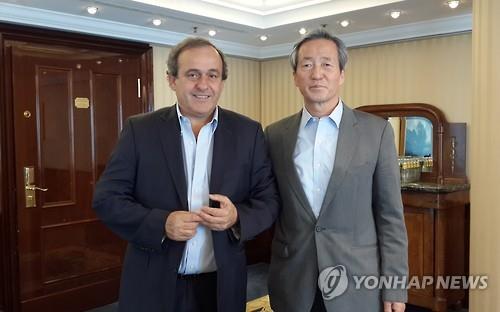 | △ 지난 6일 독일 베를린에서 미셸 플라티니 유럽축구연맹(UEFA) 회장을 만난 정몽준 대한축구협회 명예회장.(오른쪽) |