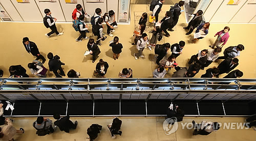 | △ 메르스 사태로 각종 취업박람회가 잇따라 연기되거나 취소되고 있다. 사진은 최근 서울에서 열린 한 취업박람회에서 구직자들이 채용게시대를 살피고 있는 모습. (연합뉴스 자료사진) |