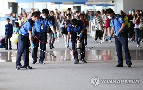 | △ '메르스 차단' 위해 공항 방역 (영종도=연합뉴스) 신준희 기자 = 메르스(중동호흡기증후군) 격리 대상자가 1천364명으로 늘어나면서 감염에 대한 국민들의 공포와 우려가 더욱 심화된 가운데 3일 오후 영종도 인천국제공항 입국장에서 방역업체 직원들이 방역 작업을 하고 있다. 2015.6.3 hama@yna.co.kr |