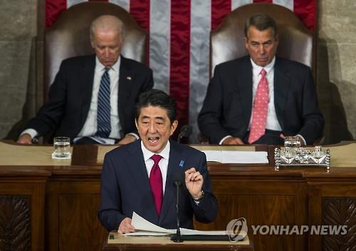 | △ 2015년 4월 29일(현지시간) 아베 신조 일본 총리가 미국 상하원 합동 연설을 하고 있다(EPA=연합뉴스 자료사진) |