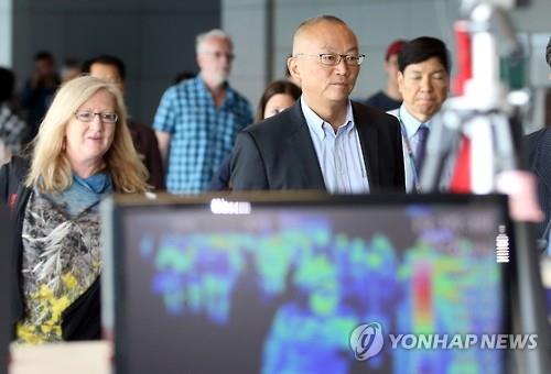 | △ 후쿠다 게이지(福田敬二) 세계보건기구(WHO) 사무차장이 중동호흡기증후군(메르스) 국내 확산 상황을 조사하기 위해 8일 오후 합동조사단을 이끌고 인천공항을 통해 입국, 발열감지 카메라가 설치된 검역대를 통과하고 있다. |