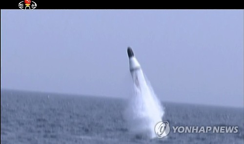 | △ 북한 조선중앙TV가 방영한 잠수함 발사 탄도미사일(SLBM) 시험발사 장면(연합뉴스 자료사진) |