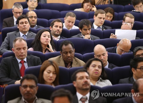 | △ 한국 정부의 메르스 대응이 궁금합니다 (서울=연합뉴스) 황광모 기자 = 주한 외국대사관 대표들이 8일 오후 서울 도렴동 외교부 청사에서 열린 '한국 내 중동호흡기증후군(메르스) 현황과 한국 정부의 대응 조치'에 대한 브리핑에 참석해 정부 관계자의 현황 보고를 주의 깊게 듣고 있다. 이 브리핑에는 78개국의 주한 대사관 대표들이 참석했으며, 정부에서는 외교부, 보건복지부, 민간 감염전문의가 참석해 한국의 메르스 대응 상황에 대해 설명했다. 2015.6.8 hkmpooh@yna.co.kr |