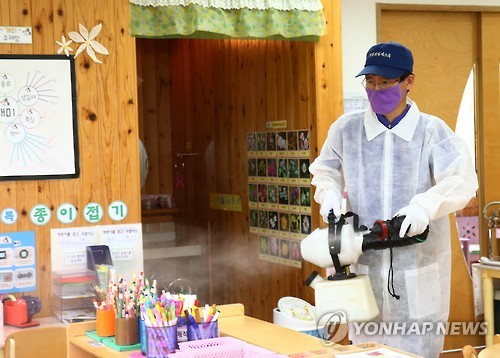 | △ "메르스 확산 막자" 유성구, 유치원 소독 (대전=연합뉴스) 9일 대전 유성구 한 유치원에서 유성구청 관계자가 중동호흡기증후군(메르스) 확산 방지를 위한 소독 작업을 하고 있다. 구는 어린이집 469곳, 유치원 73곳, 초등학교 37곳, 복지체육시설 185곳 등 총 764곳에 대해 엿새에 걸쳐 긴급 방역을 펼칠 예정이라고 밝혔다. 2015.6.9 << 유성구 >> walden@yna.co.kr |