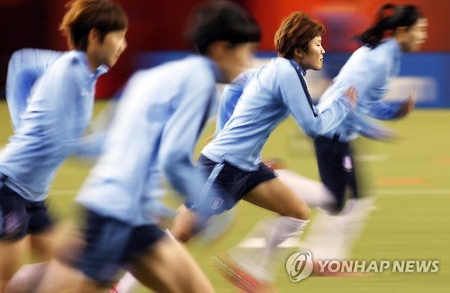 | △ 달려라, 지소연 (몬트리올=연합뉴스) 신준희 기자 = 대한민국 여자 축구 대표팀 지소연 등 선수들이 9일 오전(한국시간) 캐나다 몬트리올 올림픽 스타디움에서 훈련을 하고 있다. 우리나라는 한국시간 10일 오전 2015 캐나다 여자 월드컵 조별리그 E조 브라질과의 예선 첫 경기를 치른다. 2015.6.9 hama@yna.co.kr |
