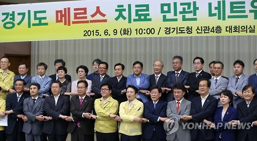 | △ 메르스 대응 "경기도 민-관 병원 함께 나선다" (수원=연합뉴스) 신영근 기자 = 9일 오전 경기도 수원 경기도청에서 남경필 경기도지사와 경기도내 대형 병원 병원장과 이사장이 참석한 가운데 '경기도 메르스 치료 민-관 네트워크' 출범식이 열려 참석자들이 메르스 극복에 최선을 다할 것을 다짐하고 있다. |