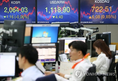 | △ '코스닥은 올랐지만' (서울=연합뉴스) 한종찬 기자 = 코스닥 지수가 9일 나흘째 상승 랠리를 이어가며 7년 6개월 만에 720선을 돌파했다. 코스닥 지수는 전날보다 6.08포인트(0.85%) 오른 722.51에 마감했다. 코스닥 지수가 720선을 넘은 것은 종가 기준으로 지난 2007년 12월 14일 725.53을 기록한 이후 7년 6개월 만이다. 반면 미국 금리 인상 우려와 중동호흡기증후군(메르스) 등 대내외 악재에 둘러싸인 코스피는 사흘째 약세를 보였다. 코스피는 전날보다 1.16포인트(0.06%) 내린 2,064.03에 마감했다. 사진은 이날 오후 서울 을지로 외환은행 본점 딜링룸. |