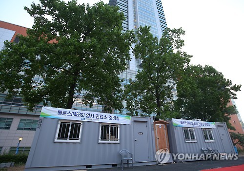 | △ 서울성모병원 메르스 임시 진료소 (서울=연합뉴스) 김도훈 기자 = 9일 중동호흡기증후군(메르스) 환자가 발생한 서울 서초구 서울성모병원 응급실 앞에 설치된 메르스 임시 진료소 모습. |