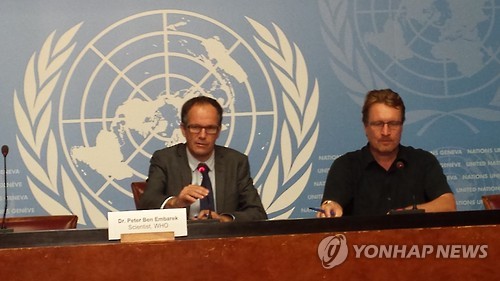 | △ WHO 엠바렉 박사 "한국, 메르스 지속 감염 국가 아냐" (제네바=연합뉴스) 류현성 특파원 = 세계보건기구(WHO)의 피터 벤 엠바렉 박사는 9일(현지시간) 한국의 중동호흡기증후군(메르스) 발병과 관련해 "한국은 메르스가 계속 반복적으로 발생하는 지속 감염국가가 아니다"라고 밝혔다. 사진은 스위스 제네바 유럽 유엔본부에서 한국의 메르스 발병 상황에 대해 브리핑을 하고 있는 엠바렉 박사(왼쪽)의 모습. 2015.6.10 rhew@yna.co.kr |