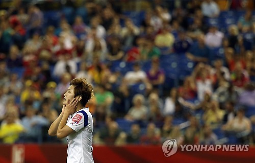 | △ 아쉬움 달래는 지소연 (몬트리올=연합뉴스) 신준희 기자 = 10일 오전(한국시간) 캐나다 몬트리올 올림픽 스타디움에서 열린 2015 캐나다 여자 월드컵 조별리그 한국과 브라질의 경기. 한국 지소연이 골 찬스를 놓친 뒤 아쉬운 표정을 짓고 있다. 2015.6.10 hama@yna.co.kr |