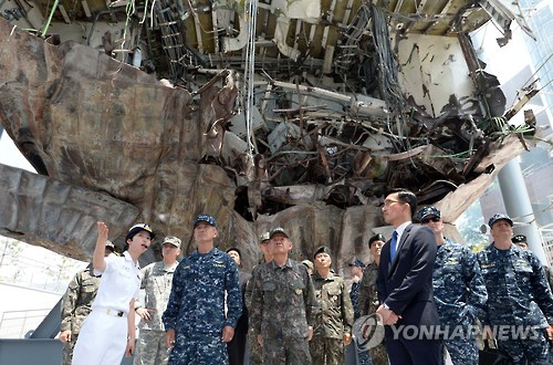 | △ 美 태평양사령관 2함대사 방문 (평택 사진공동취재단=연합뉴스) 해리 해리스 신임 미국 태평양 사령관(앞줄 왼쪽 두번째)과 최윤희 합참의장(앞줄 왼쪽 세번째)이 10일 오전 경기도 해군 2함대 안보공원에서 희생 장병을 추모한 뒤 전시된 천안함 선체를 둘러보고 있다. 2015.6.10 photo@yna.co.kr |