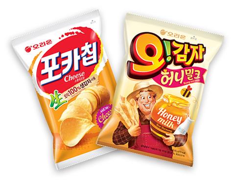 오리온은 지난해 7월 출시한 달콤한 생감자 스낵 '포카칩 스윗치즈'와 지난 2월 선보인 성형감자 스낵 '오!감자 허니밀크'가 각각 '포카칩' 및 '오!감자' 브랜드 내 판매액 1위를 차지했다고 10일 밝혔다.