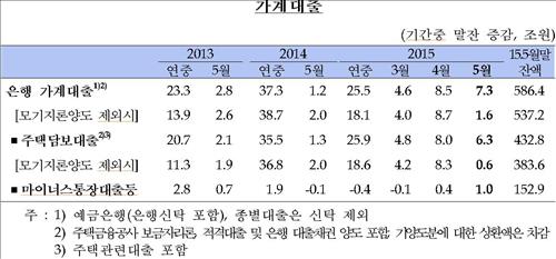 전달 증가폭은 2008년 이후 월간 은행의 가계대출 증가액으로 최대였던 4월(8조5천억원)보다 작았지만 예년과 비교하면 여전히 급격한 증가세를 유지했다.