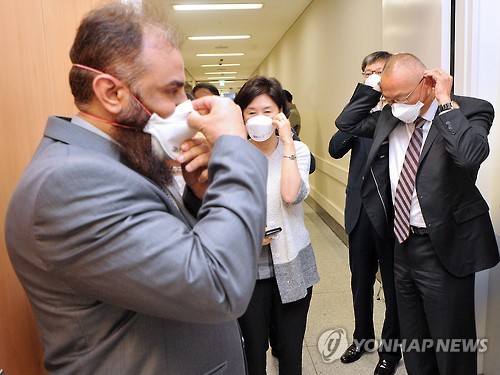 | △ 마스크 착용하는 WHO 합동조사단 (서울=연합뉴스) 후쿠다 게이지 WHO 사무차장 등 메르스 합동조사단이 10일 삼성서울병원을 방문해 응급실과 병실 등을 둘러보기 전 마스크를 쓰고 있다. (보건복지부 제공) |