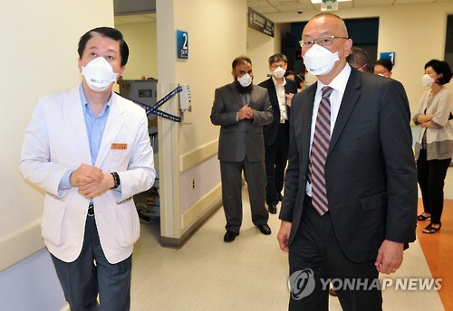 | △ WHO 메르스 합동평가단, 삼성서울병원 방문 (서울=연합뉴스) 후쿠다 게이지 WHO 사무차장 등 메르스 합동평가단이 10일 삼성서울병원을 방문해 응급실과 병실 등을 둘러보고 있다. (보건복지부 제공) |