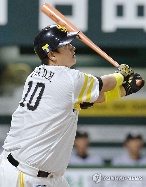| △ 이대호, 시즌 16호 홈런 (후쿠오카 교도=연합뉴스) 일본 프로야구 소프트뱅크 호크스 이대호가 10일 일본 후쿠오카 야후오크돔에서 열린 인터리그 한신과의 경기 2회말 1사, 오른쪽 담장을 넘기는 홈런을 치고 있다. 2015.6.10 seephoto@yna.co.kr |