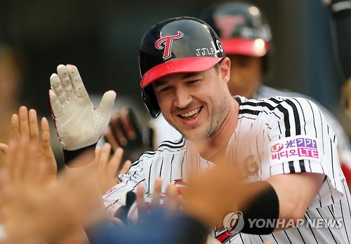 | △ 한나한, '3점 홈런' (서울=연합뉴스) 윤동진 기자 = 10일 오후 서울 송파구 잠실야구장에서 열린 2015 프로야구 두산 대 LG의 경기. 1회 말 1사 1,2루 때 LG 한나한이 3점 홈런을 친 후 더그아웃으로 들어와 동료들과 하이파이브를 하고 있다. 2015.6.10 mon@yna.co.kr |