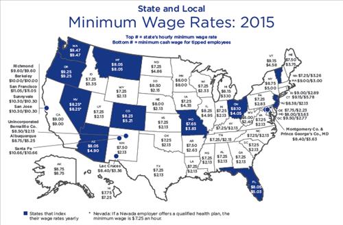 연방 단위의 법정 최저임금은 시간당 7.25달러지만 진보적 성향의 주와 시 정부들은 개별적으로 시간당 최저임금 인상을 추진해 왔다. 오바마 행정부도 의회를 상대로 시간당 최저임금 인상을 압박하는 것으로 전해졌다.