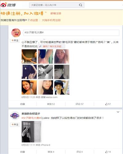 접수가 마감된 지난 10일까지 모두 40여명의 참가자들이 겨드랑이털을 깎지 않은 자연스러운 모습을 찍어 웨이보에 올렸다.