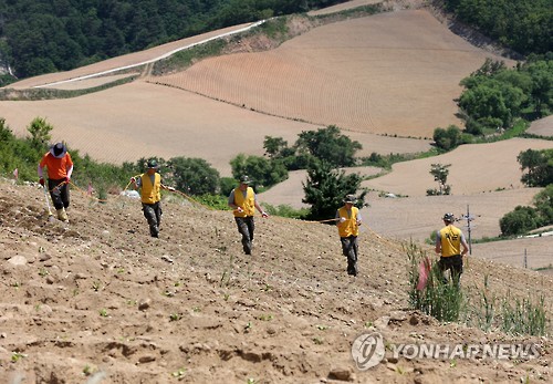 | △ "가뭄 극복하자"…군 장병 지원 (강릉=연합뉴스) 유형재 기자 = 10일 극심한 가뭄으로 어려움을 겪는 강원 강릉시 왕산면 대기리 국내 최대의 고랭지 채소재배단지인 안반데기에서 육군 36보병사단 대관령부대 장병들이 농민과 함께 물을 주며 가뭄 극복을 돕고 있다. 2015.6.10 yoo21@yna.co.kr http://blog.yonhapnews.co.kr/yoo21/ |