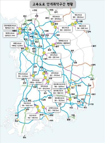 안개취약 구간은 시정거리 250m 이하 짙은 안개가 연 30일 이상 지속하거나 안개로 대형사고(사망자 3명, 사상자 20명 이상)가 발생한 곳 가운데 고속도로를 우선으로 선정했다.