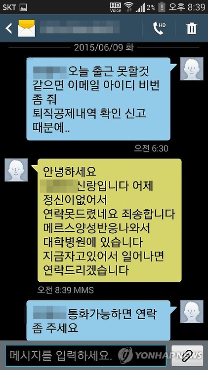 '여직원 A씨가 이틀째 결근해 연락을 취했는데 여직원의 남편이 '아내가 메르스에 감염돼 출근하지 못한다'는 내용의 문자 메시지를 보내왔다'고 신고한 것이다.