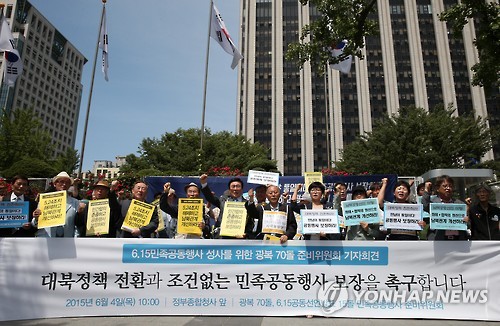 (서울=연합뉴스) 이상현 기자 = '광복 70돌, 6·15 공동선언 15돌 민족공동행사 준비위원회'는 12일 6·15 민족공동행사 무산을 공식화하고 무산의 가장 근본적인 원인은 정부의 대북 적대 정책이라고 비판했다.