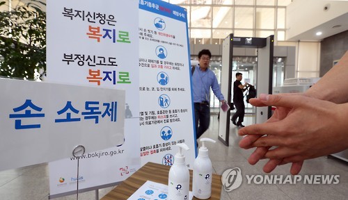 | △ 손 소독제 비치된 정부청사 (세종=연합뉴스) 배재만 기자 = 중동호흡기증후군(메르스) 예방을 위해 정부세종청사 각 부처 출입구에 손소독제와 예방 안내문이 비치된 가운데 12일 오전 보건복지부 출입구에서 출입자들이 손 소독을 하고 있다. 2015.6.12 scoop@yna.co.kr http://blog.yonhapnews.co.kr/f6464 |