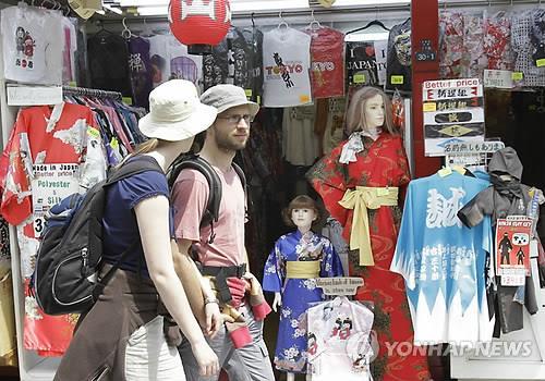 | △ 일본 도쿄 아사쿠사의 상점가를 지나가는 외국인 관광객(AP.연합뉴스.자료사진) |