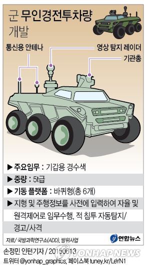 | △ <그래픽> 군 무인경전투차량 개발 (서울=연합뉴스) 김토일 기자 = 우리 군이 내년 중으로 '경전투로봇' 통합운영 및 제어기술을 확보, 연구 개발에 착수할 것으로 알려졌다. 13일 국방과학연구소(ADD)와 방위사업청에 따르면 ADD는 2012년부터 경전투로봇 개발에 필요한 통합운용·제어기술 연구에 착수했으며 내년 중 완료할 계획이다. kmtoil@yna.co.kr 페이스북 tuney.kr/LeYN1 트위터 @yonhap_graphics |