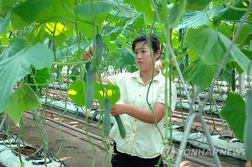 | △ 북한의 한 온실 채소 단지에서 여성이 작물의 상태를 살펴보고 있다. 2015.6.13.<<연합뉴스DB>> |