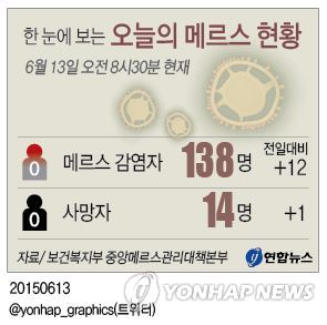 보건복지부 중앙메르스관리대책본부는 12명의 메르스 환자가 유전자 검사에서 확진 판정을 받아 환자수가 138명으로 늘었다고 13일 밝혔다.