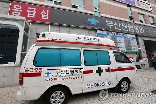 | △ 부산센텀병원 응급실 (부산=연합뉴스) 조정호 기자 = 부산에서 확인된 중동호흡기증후군(메르스) 확진자 이모(31)씨가 진료를 받은 부산센텀병원 응급실과 구급차. 이씨가 지난 2일 복통을 동반한 몸살 증세로 부산센텀병원을 응급실을 찾았지만, 병원 측은 메르스 감염을 의심하지 않았다. 2015.6.13 ccho@yna.co.kr |