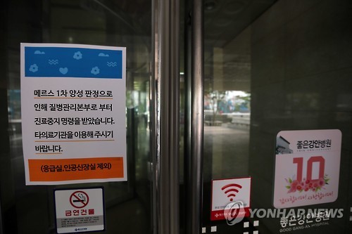 | △ 부산 좋은강안병원 '진료중지' (부산=연합뉴스) 조정호 기자 = 부산에서 확인된 중동호흡기증후군(메르스) 확진자 이모(31)씨가 입원치료를 받은 부산 좋은강안병원 입구에 13일 질병관리본부가 이 병원에 대해 진료중지명령(응급실, 인공신장실 제외)을 내렸다는 안내문이 붙었다. 보건당국이 부산지역 병원 3곳과 이씨의 근무지를 확인해보니 현재까지 이씨와 접촉한 사람이 717명에 달하는 것으로 나타났다. 2015.6.13 ccho@yna.co.kr |