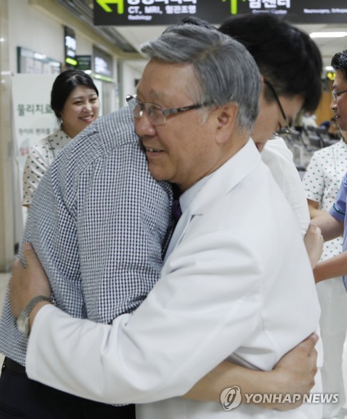 | △ 복귀 의료진 안아주는 건양대병원장 (대전=연합뉴스) 14일 현재 의료진과 직원 등 58명이 중동호흡기증후군(메르스) 감염 예방을 위해 자택 격리됐다가 복귀한 대전 서구 건양대병원에서 박창일 의료원장이 출근한 의사를 끌어안으며 환영하고 있다. 병원 측은 남은 직원 2명도 오는 17일 정상복귀할 것으로 예상했다. 2015.6.14 << 건양대병원 >> walden@yna.co.kr |