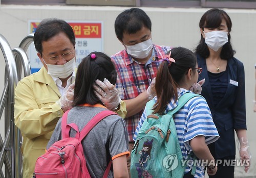 | △ 발열 체크하는 김석준 부산교육감 (부산=연합뉴스) 차근호 기자 = 김석준 부산시 교육감이 9일 오전 부산의 한 초등학교를 찾아 등굣길 학생들의 체온을 측정하고 있다. 2015.6.9 ready@yna.co.kr |