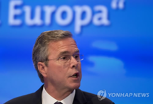 | △ 젭 부시, 대선 출마선언 앞두고 외교무대 밟아 (베를린 AP=연합뉴스) 미국 공화당의 가장 유력한 대권주자로 꼽히는 젭 부시 전 플로리다 주지사가 공식 출마선언을 약 1주일 남겨놓은 지난 9일(현지시간) 독일 베를린에서 기업인을 대상으로 열린 한 강연에 참석하고 있다. 부시 전 주지사는 주지사 시절에도 외국을 공식 방문한 적이 있지만 유력 대선주자의 신분으로 국제무대에 서는 것은 이번이 처음이다. |