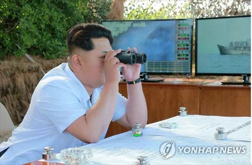 | △ '미사일 잘 날아가나' 발사 훈련 참관하는 김정은 (서울=연합뉴스) 북한이 해군 부대들에 실전 배치 중인 신형 반(反)함선(대함) 미사일 발사 훈련을 실시했다고 노동신문이 15일 보도했다. 김정은 국방위원회 제1위원장이 발사 훈련을 참관하고 있다. 2015.6.15 nkphoto@yna.co.kr |