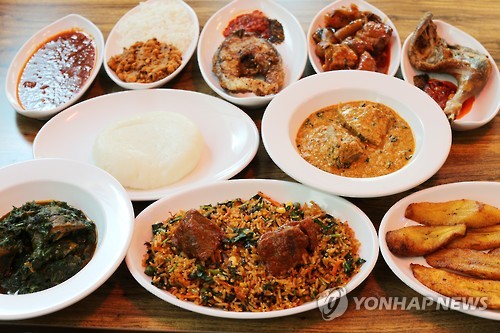 | △ 아프리카 식당 '해피 홈' (서울=연합뉴스) 김주형 기자 = 이태원의 아프리카 식당 '해피 홈' 대표 메뉴. 나이지리아 출신 이주민이 운영하는 '해피 홈'은 나이지리아와 가나 등 서아프리카 지역 음식을 전문으로 한다. 2015.6.15 kjhpress@yna.co.kr |